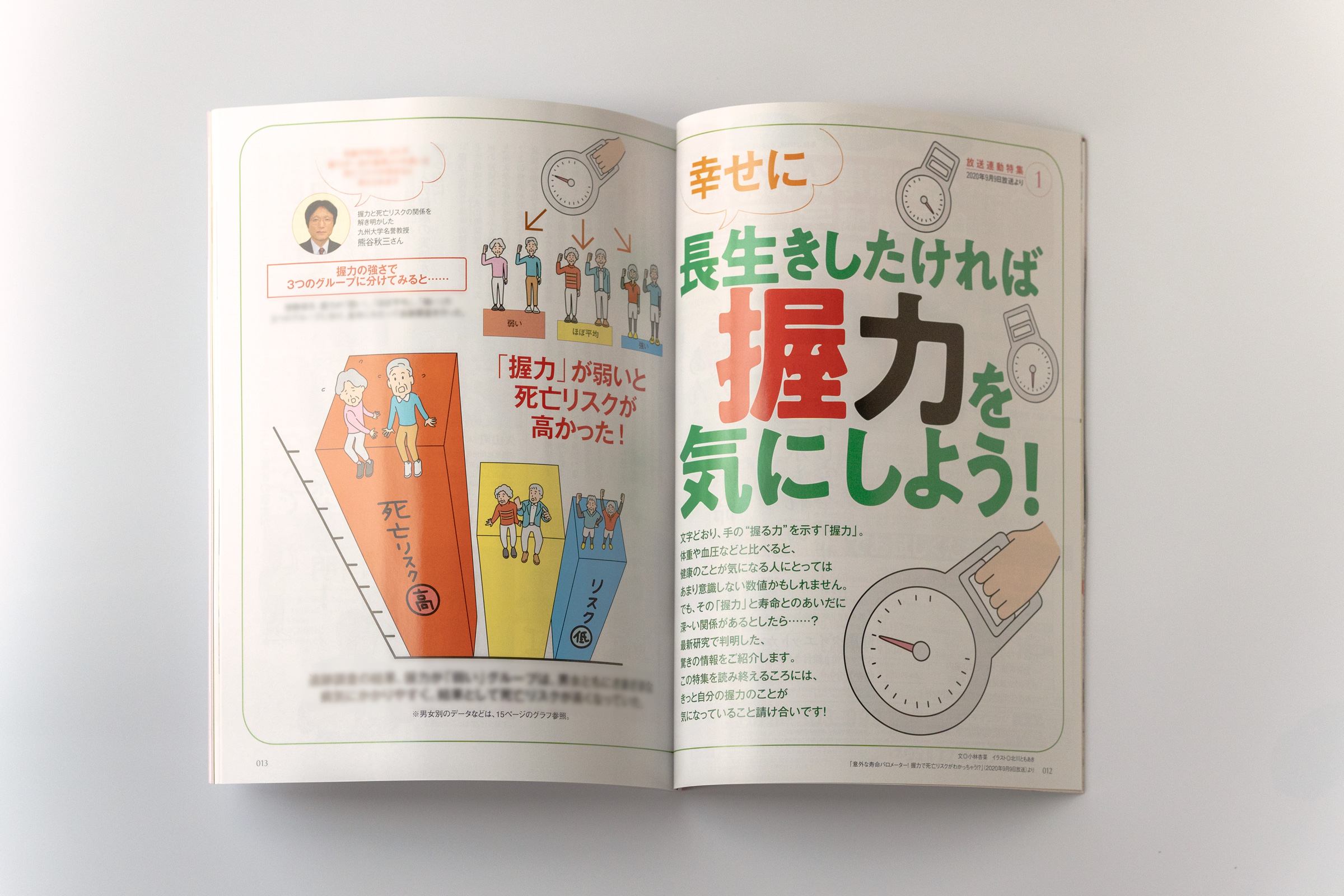 主婦と生活社『NHKガッテン!』特集カットイラスト 主婦と生活社様から発売された「NHKガッテン!」2021年春号の第一特集のカットイラストを担当させていただきました。トビラの握力計のイラストは、表紙でも使用していただいております。 2021年9月24日 投稿先 Client Work, Gallery ← 過去の投稿へ 次の投稿へ →