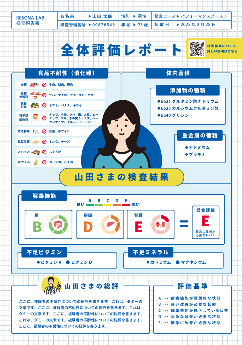 NANALABO DESIGN 迫田様のご依頼で、RESONA-LAB様(FINETUNING様)の不耐性検査のレポート・案内パンフレットで使用されるイラストを描かせていただきました。